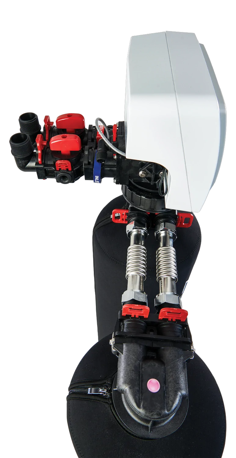 Brine tank with safety float, air check and injection molded brine grid to reduce bridging. Moisture wicking neoprene tank jacket included on all pressure tanks.